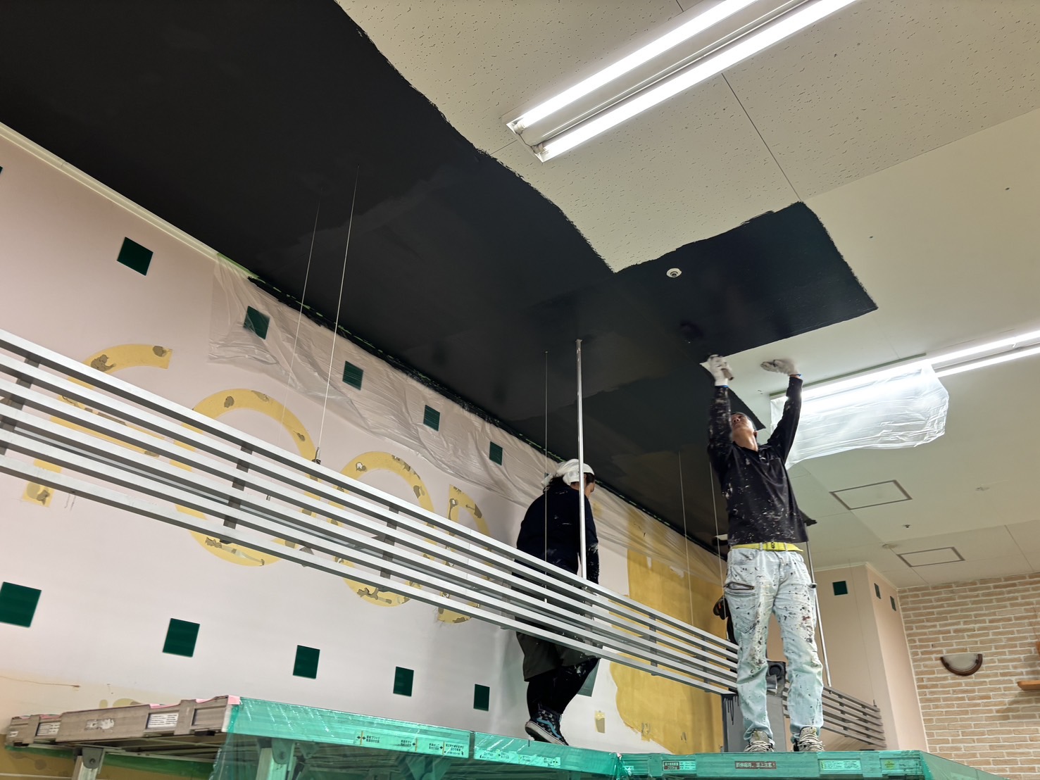 作業中は、既存天井の汚れをしっかりと除去し、下地処理を丁寧に行ってから塗装を実施。
