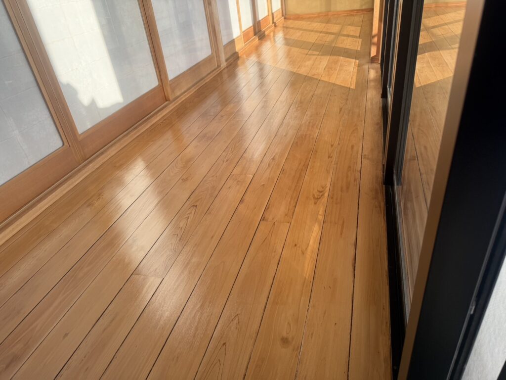 【木部塗装】縁側が見違えるように明るく!自然なツヤでぬくもりある空間に【壬生町】