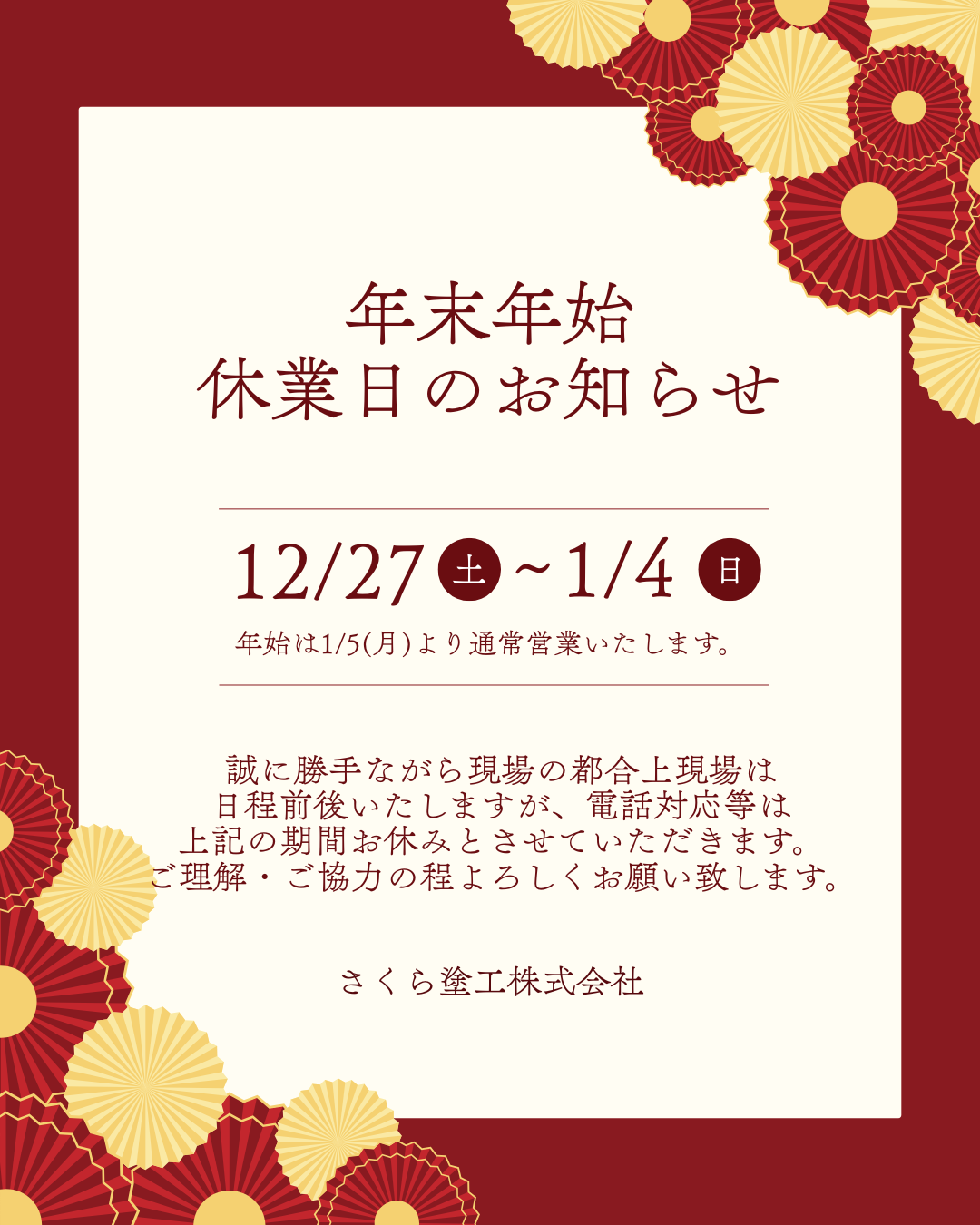 さくら塗工は、12月27日よりお休みに入らせていただきます😉